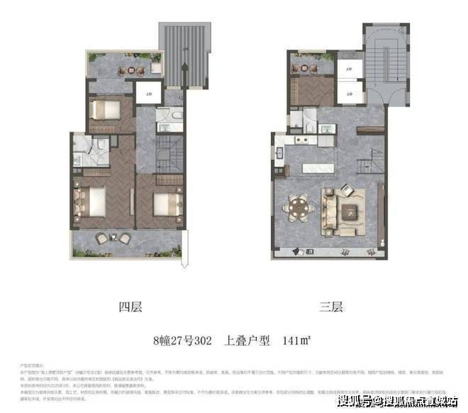 建面约141㎡上叠,餐客横厅设计,会朋宴客尽显风范;上层空间连通露台,可以瑜伽健身、莳花弄草,丰盈生活的厚度;多重卧室设计,功能性更强、更实用。