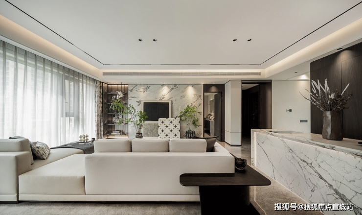 一座外延大堂,一座入户大堂,最高约5.2米挑高,搭配华贵的灯饰、考究的石材,完全遵循高端酒店标准来打造。宽奢明亮的空间,给足归家礼遇的同时,也撑起了业主的身份标签和面子。
