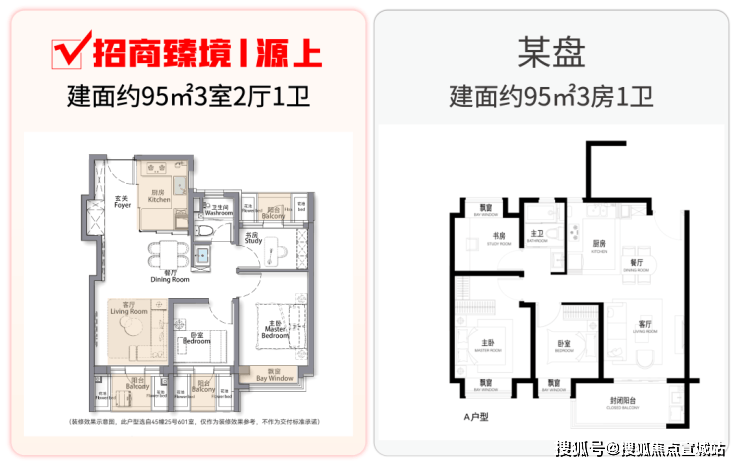 但招商臻境源上的建面约95㎡3房却截然不同,TA凭借着3阳台的设计,给到客户一个真正的三房户型: