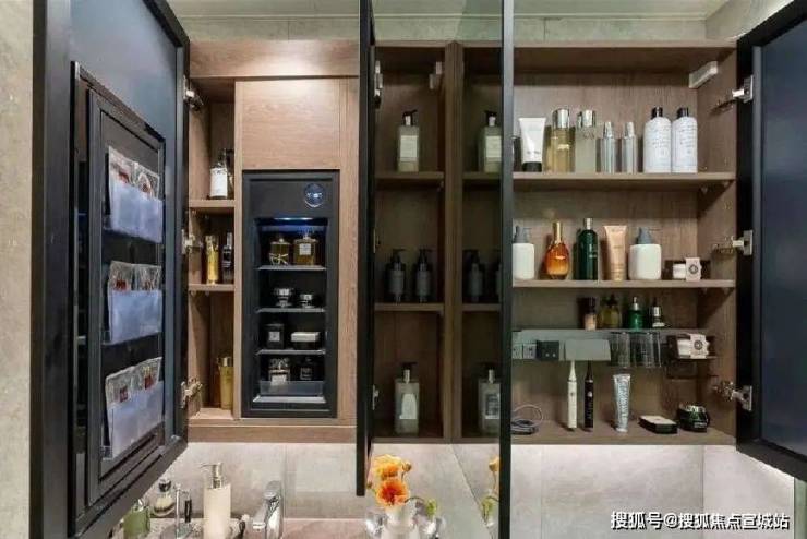 主次卫皆选用了松下的智能马桶。主卫的镜柜内还设计了美妆冰箱和集成柜,不仅可以更好地贮藏名贵化妆品,而且也是更合理的化妆动线设计。