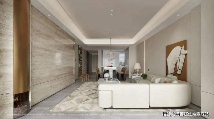 会客空间约有50平,餐客厅一体化足足有近百平,尺度感超强。