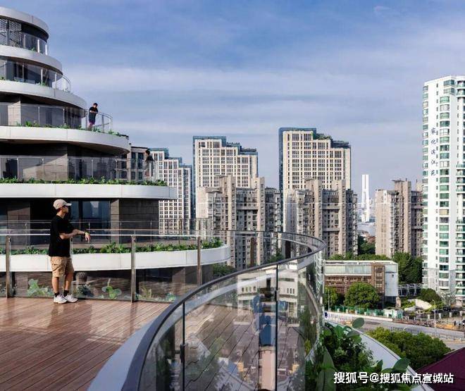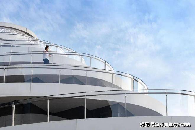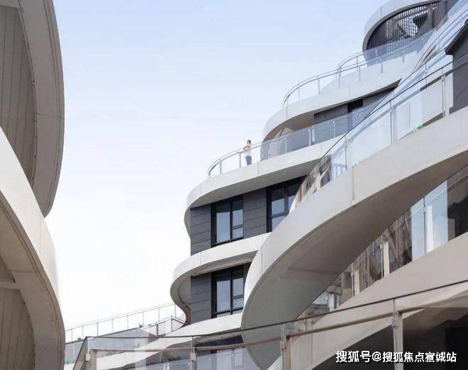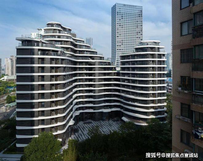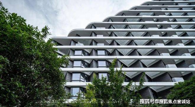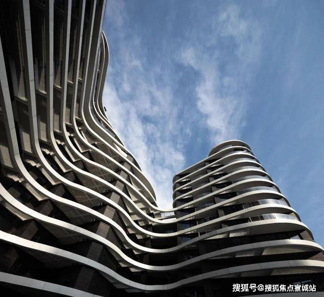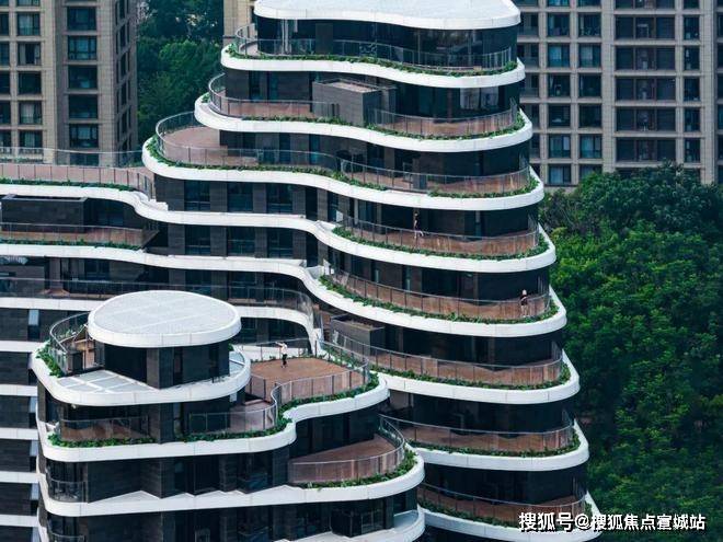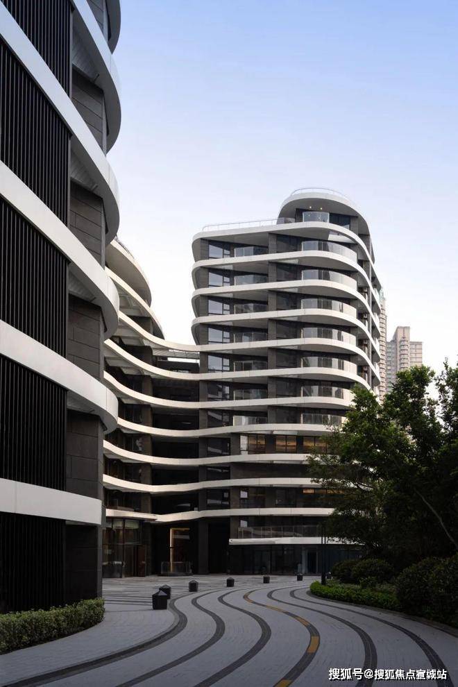 建筑向上层层叠高、向内退进的波浪线型,形成了多维立体的生态居住空间。垂直叠置的弧线形露天观景平台作为私享空间,并根据不同朝向的户型将露台角度开设到最宽,呈现“全画幅”式的景观视野,将城市景观价值最大化的同时,也串联立面转折、观景阳台、屋顶绿化和空中花园,消隐弱化了传统住宅前后错动的复杂轮廓,强化建筑的整体性。柔美的立面山水景观也点染了城市界面,退后的部分更像是传统山水画中的“留白”处理,引人无限遐思。