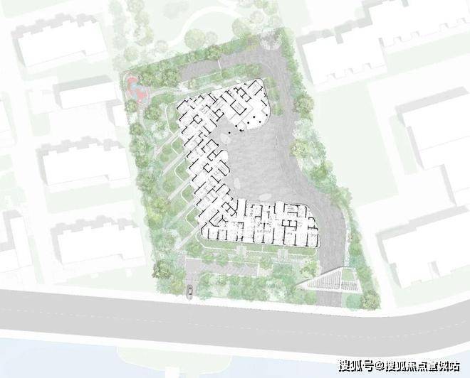 项目西侧立面为景观资源最好的滨江面,建筑师经过反复的设计推敲,最终决定将西立面上的户型向南旋转一定角度,形成错动转折的立面效果——折面朝西为实体墙面,折面朝南为客厅、卧室开窗,从而兼顾居住功能与滨江一侧的立面审美。同时,折面与水平飘带交织形成三角形的阳台、遮阳格栅,进一步减小西晒对室内热环境的影响,满足了东西朝向住宅的日照采光需求。