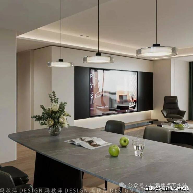 餐厨区域与客厅以开放式格局相连,却通过巧妙的设计手法,自然勾勒出相对独立的用餐天地。一张长形餐桌以灰色石材为面,细腻的纹理如天然的艺术画作,尽显沉稳大气。搭配深灰皮质餐椅,利落的线条纵横交错,为空间注入一份利落与干练。三盏环形吊灯垂坠而下,暖黄的光晕温柔地倾泻在餐桌上,为每一顿餐食赋予了仪式感。餐桌上,精心摆放的花艺与青苹果摆件相映成趣,灵动的气息弥漫其间,让这个餐厨区处处流淌着生活的温度。