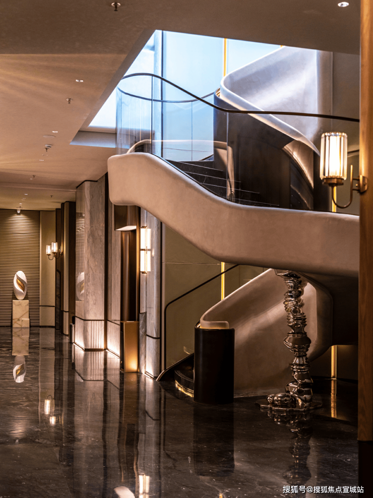 约66米宽宏的门庭之上,成吨维多利亚白奢石与精致雕花金属舒展排布,既彰显显性的奢华大气,又暗藏细腻的文化情绪。