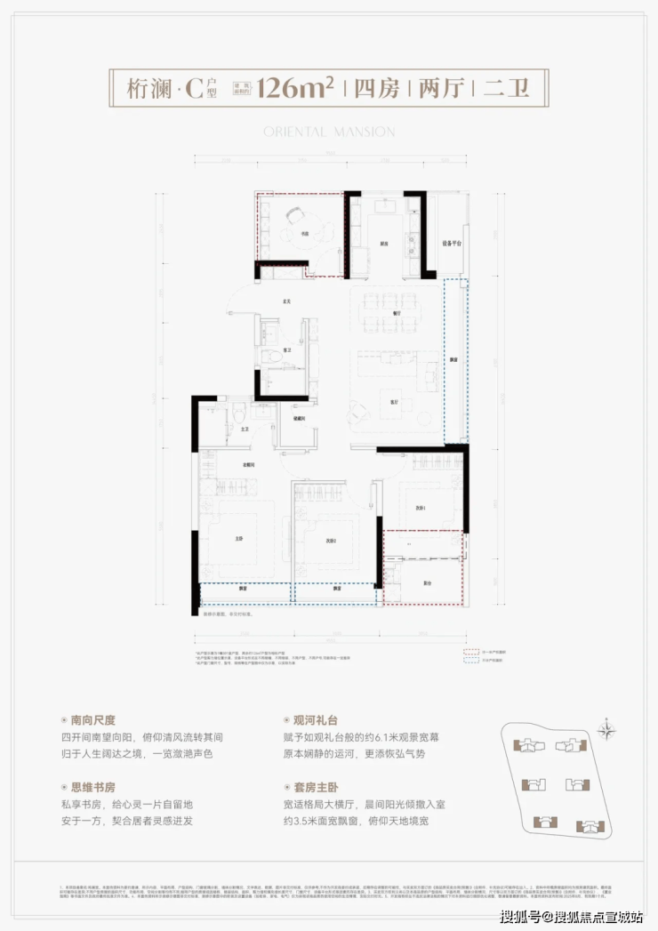 以项目约126㎡C户型为例,其整体格局与相邻竞品约139㎡户型格局高度相似,均为三开间朝南+横厅设计。