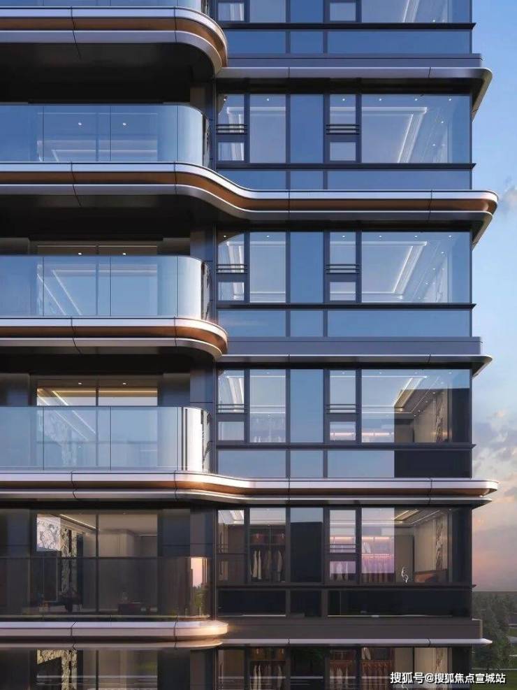翎翠滨江采用张力弧线立面,18 道转折截面、40 公分大出挑,呼应滨江韵律;大面积玻璃幕墙搭配高窗墙比与开阔楼间距,日均超6小时日照,公园与城市景观尽收眼底。