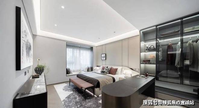 此外,不得不感慨此户型主卧大套房的尺度感,开间约4.8米,不仅带有超大飘窗,还享有独立大衣帽间+双台盆+大浴缸豪华配置,令人羡慕。
