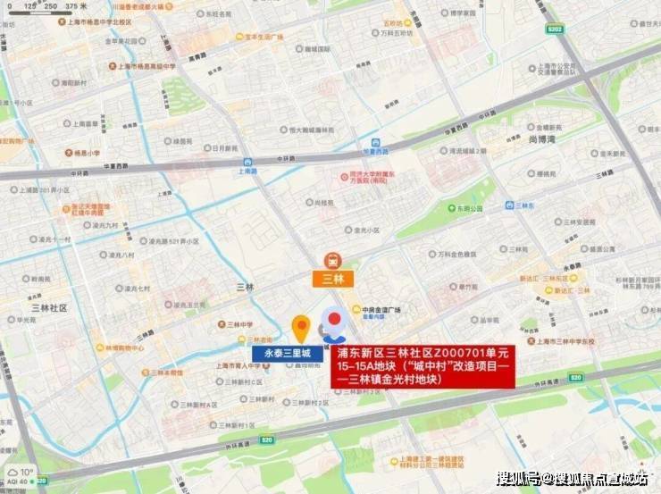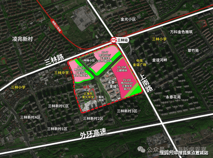 该地块为三林镇金光村“城中村”改造的重点项目,紧邻地铁11号线三林站,规划一条12米宽公共步行通道,连接社区与地铁站;同时周边有中房金谊广场、三林中学、东方医院等生活配套.