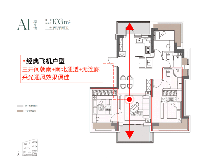 建面103㎡3房2厅2卫,户型三开间朝南、室内“5个飘窗+2阳台”,不管是采光、视野、通风、私密性,还是实用性都十分出色。