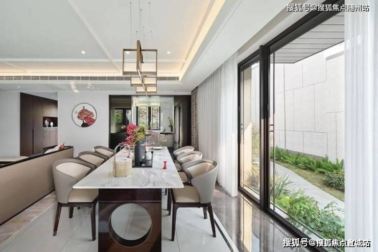 建面约259㎡边套下叠的客餐厅面积占了单层近一半, L型采光大客厅,连北向的楼梯井都做到了全明,阳台外的屋檐之下自然地形成了一个灰空间,通过与落地窗、绿篱的围合,形成私享的院落。