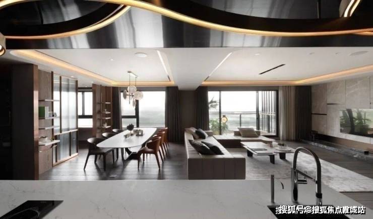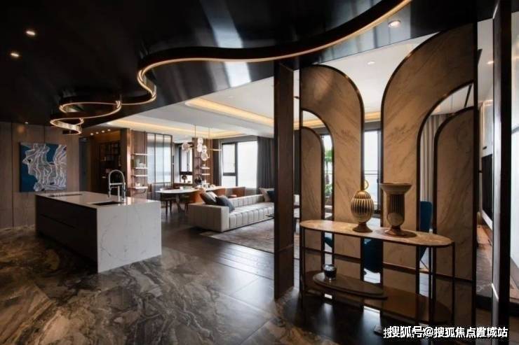 ▲玄关处加入一道金属+石材结合的屏风与端景台,布置陶艺品的装饰,让进门的第一视觉充满现代优雅的华丽感.天花上一道流线设计的造型,从玄关延伸到中岛台,也是显得更加有艺术气质.