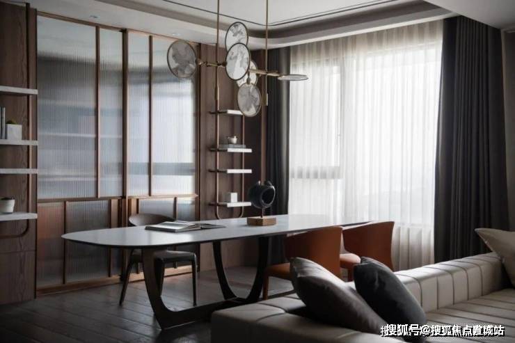 ▲餐厅旁边是书房空间,以长虹玻璃推拉门作为隔断,在金属边框的设计下,与餐厅的吊灯形成呼应,门两侧是木饰面+吊架书架的设计,也是显得简约华丽而高级.