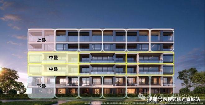而中叠(建面约123㎡)则集便利与尺度于一身:不仅配备独立电梯厅,更以约13.4米南向面宽、约6米宽厅及南北双270°转角飘窗,营造出宽幕视野与通透空间,体感媲美整层大平层,实得率几近“满格”。