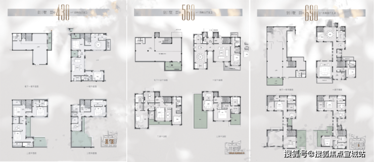 项目别墅是大头,且都是拼接型别墅:地上三层,地下一层,联排面积段为430㎡、530㎡、560㎡、700㎡,合计有23套。