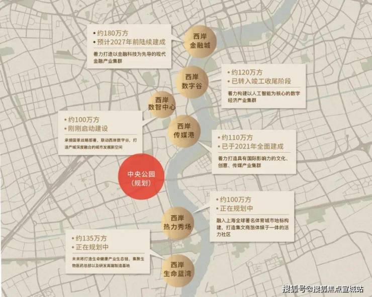 目前正在加快落地的六个百万方规划(西岸金融城、西岸数字谷、西岸传媒港、西岸热力秀场、西岸生命蓝湾和西岸数智中心),将着力打造数字经济、生命健康、文化创意、现代金融的国际产业集群。