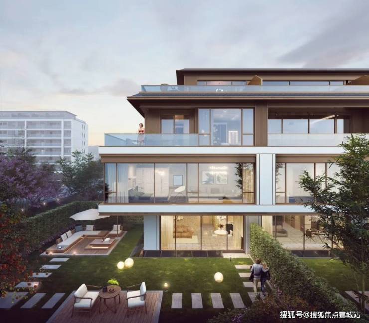 而联排部分,则是暖色调的木纹色系,配合大面积的玻璃窗,一楼是大幅落地玻璃,三楼的边套户型,并设计了巨大的露台,尽显大气华丽。