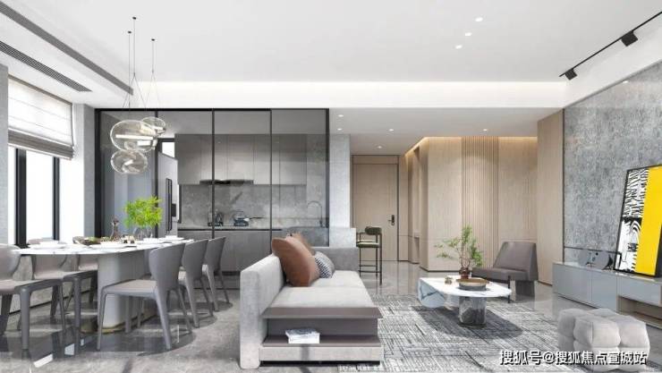 项目承袭了府系楼盘基因,依然是融创标志性的高级灰立面、横向阳台玻璃飘带,洗练且时髦.银色的L型大折板一折到底,颇有几分杭州壹号院的神韵.