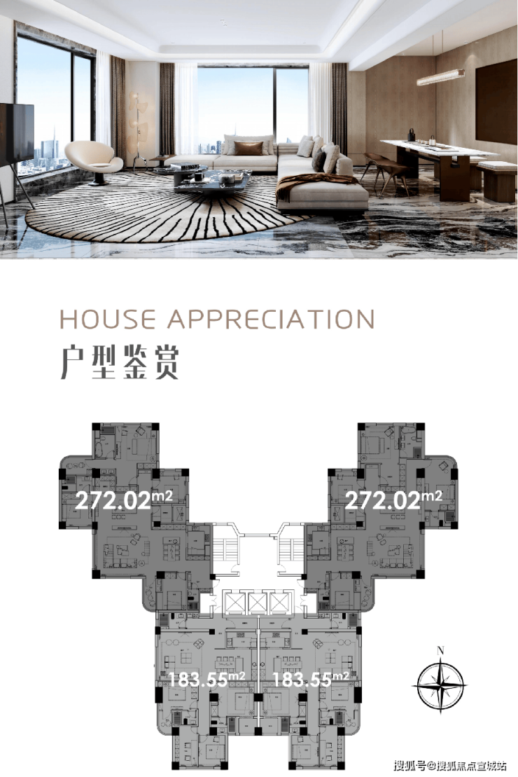 户型:有 183㎡三房两厅两卫和 272㎡四房两厅三卫等户型。183㎡户型三开间朝南,主卧套房带独立衣帽间与全明卫浴;272㎡户型南北通透双套房设计,赠送南北双阳台约 15㎡。