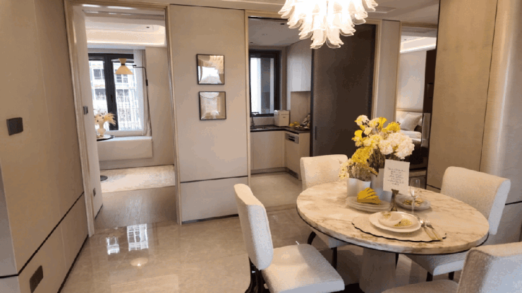 入户玄关+独立收纳间,入户动线紧凑流畅,大件收纳可即刻进柜! 随手摆放也有台面空间, 客餐厅与阳台等宽,最大程度扩展观景体验,会客就餐窗外景致就是最珍贵的装饰!