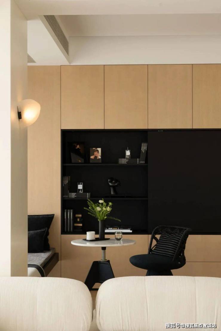 中央的B&BCamaleonda模块组合沙发,以岛状布局重构空间逻辑,双向陈设的低椅背设计。一面朝向书柜电视墙,一面衔接餐厨区。让场景切换随心意而生,既保持空间通透感,又以功能分区提升使用效率。