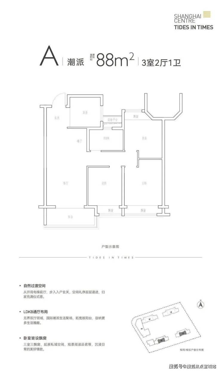 建面约88㎡3房产品,3开间朝南+3飘窗+宽阳台的3房设计,在保证实用性的同时,也让室内的通风以及视野都做到了更好。