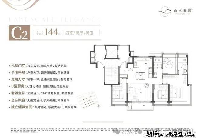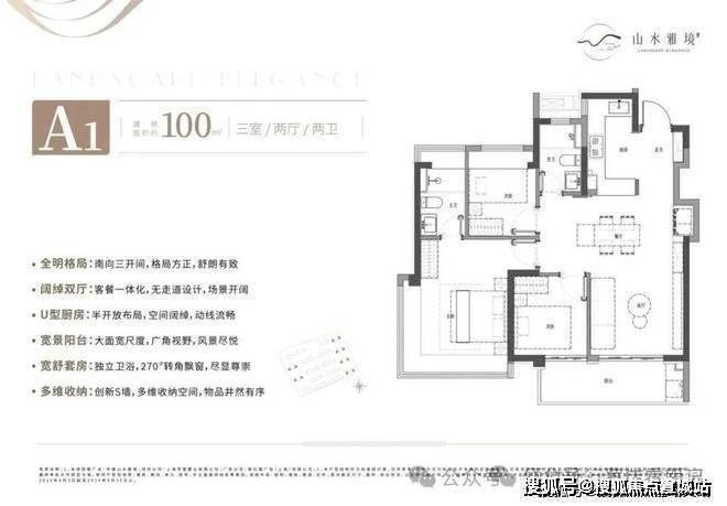 户型特色:三开间朝南、U型厨房、全屋飘窗、动静分区、主卧套房、双卫设计等。