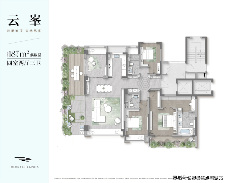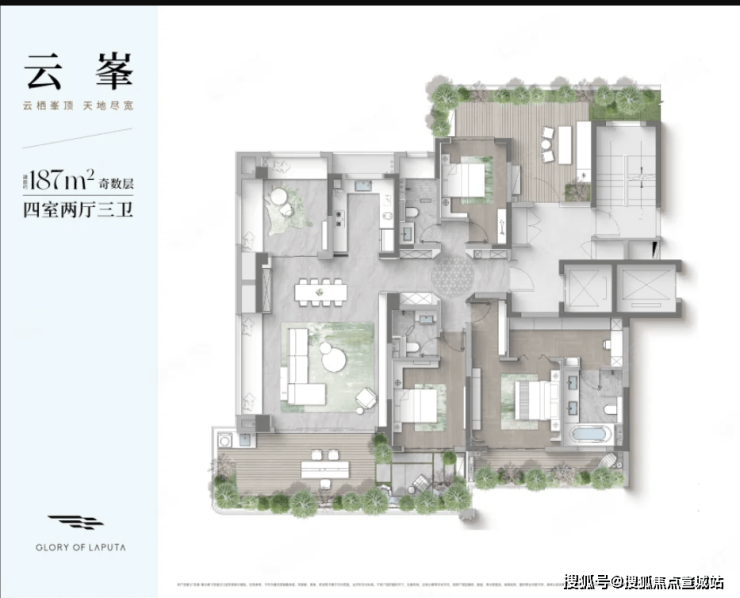 187㎡云峯:4 室 2 厅 3 卫,备案单价约 27208 元 /㎡,总价待定,顶层得房率达 130%,采用双卧室套房设计,奇偶层分别配有不同方位的多庭院。