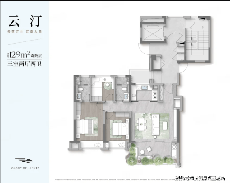 129㎡云汀:3 室 2 厅 2 卫,总价约 276 - 339 万,备案单价约 24862 元 /㎡,偶数层得房率 95%,同样 3 开间朝南,带大宽厅和空中庭院,多飘窗设计增加赠送空间。