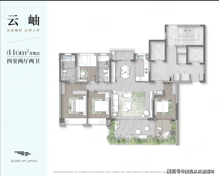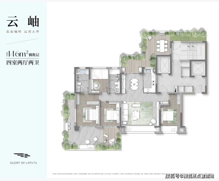 146㎡云岫:4 室 2 厅 2 卫,总价约 330 - 380 万,备案单价约 25755 元 /㎡,偶数层得房率达 123%,四开间且三卧室朝南,偶数层配有南北双庭院。