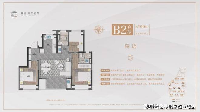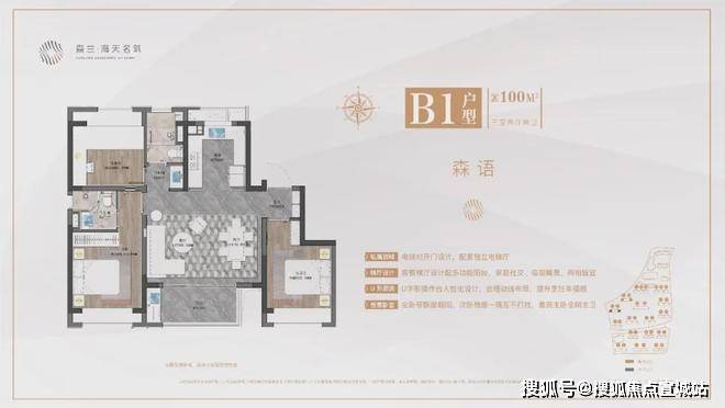 1、建面约100㎡三房两厅两卫,市场主流户型。客餐横厅设计配多功能阳台,优势在于更大采光面和更好通风效果,把过道纳入到客厅和餐厅的空间中来,使整体空间得到更好的利用。