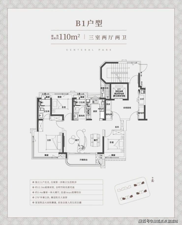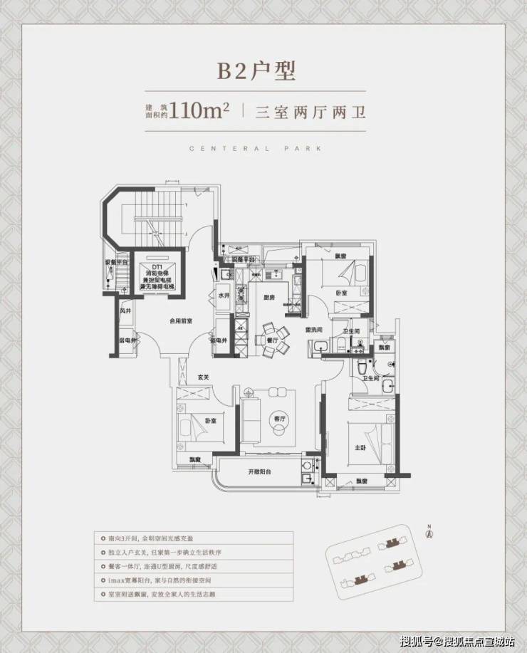 建面约 110㎡三房两厅两卫:三开间朝南,客厅连接 6.5 米观景阳台,主卧带独立卫浴与飘窗。