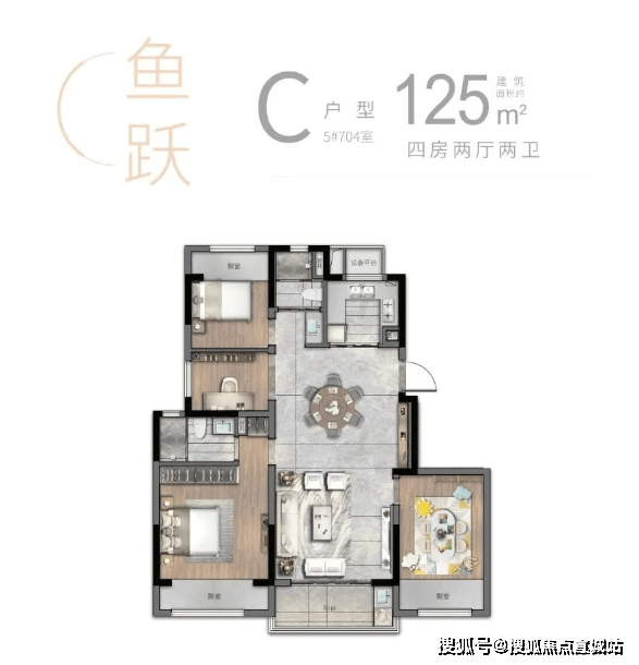 125㎡户型:4室2厅2卫,户型方正,功能分区明确,主卧套房设计,配备独立卫生间和衣帽间。