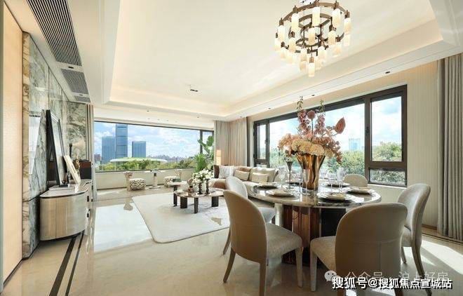 客餐尺度达约7.5米面宽,270°极致环幕窗景,实现了三面采光,无论在客厅、餐厅还是书房,葱郁园景皆如流动画卷,成为空间的主角。
