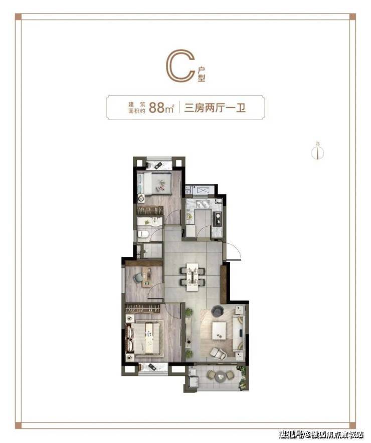 预算相对有限的,可以选这个建面约88㎡3房: