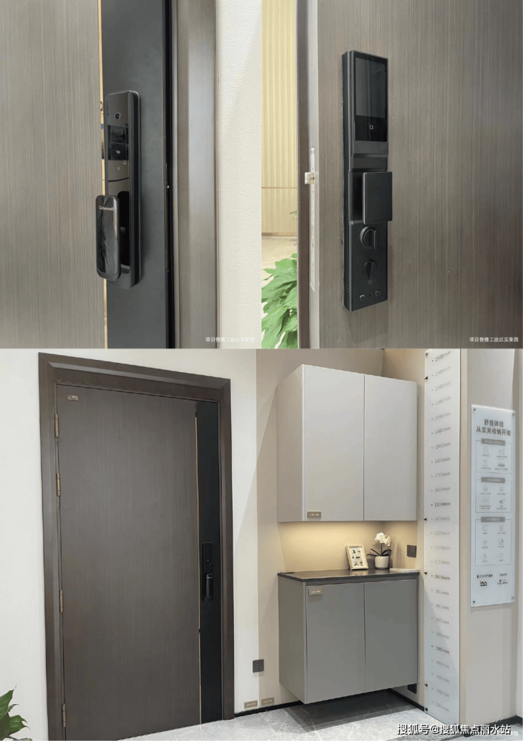 【尊崇入户赋予生活仪式感】入户——春天木门,内置锌合金龙骨架、钢板门芯和双层门框,有效保证安全;智能门锁——格里维尔,指纹、密码、临时密码、虚位密码、卡片,远程和机械钥匙七种开启方式;入户玄关——日门、大建,符合日本JAS认证的严格的F☆☆☆☆最高标准(甲醛释放量≤0.3mg/L),采用生态板材质,坚硬好打理,内部层板可调节,可以灵活摆放不同高度的物品。