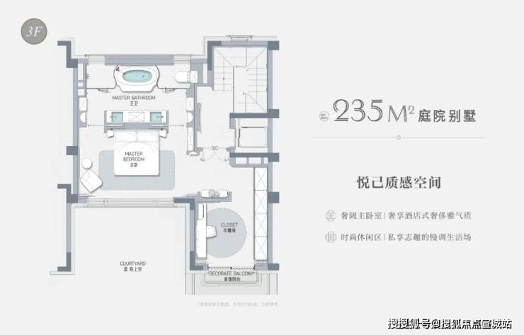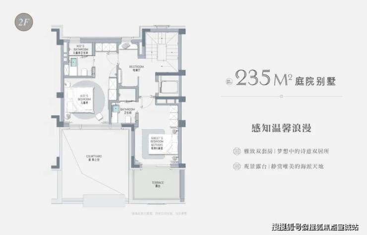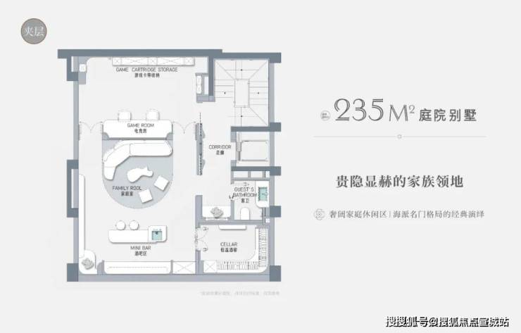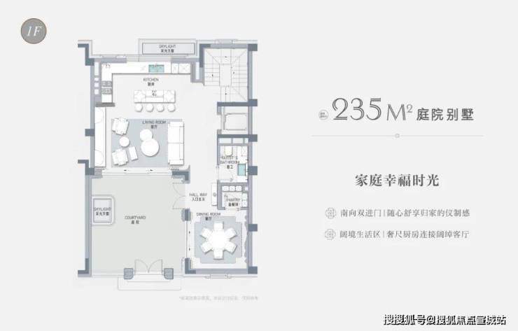 以建面约235㎡的庭院别墅样板房为例,户型附赠地下室、庭院、露台、阁楼空间,附赠面积达到户型总建面的60%左右,市场上少之又少!
