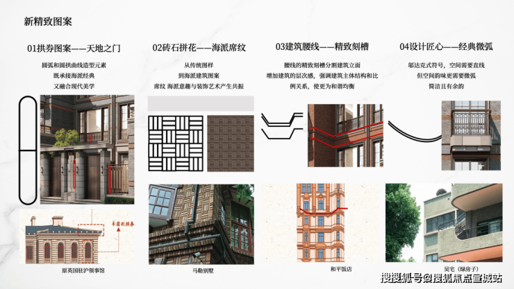 复刻马勒别墅的海派席纹砖石拼花,雕琢顶豪别墅的气场.天地之门拱券图案、精致刻槽建筑腰线、邬达克式经典微弧,勾勒风貌别墅的新精致主义格调.