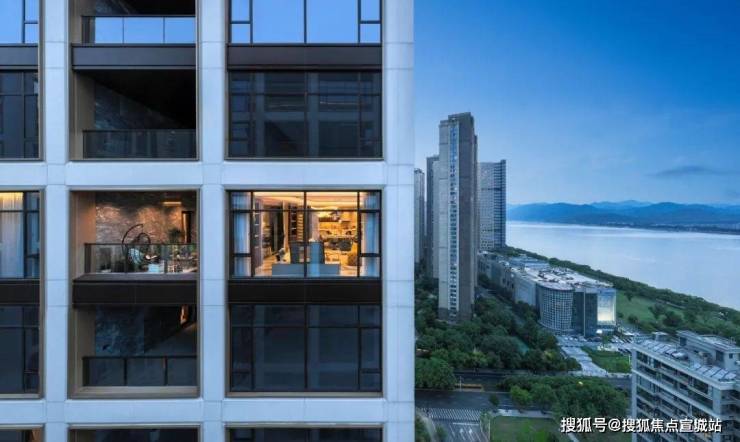 建筑以“金镶玉”为灵感,白色铝板镶嵌香槟金窗框,搭配LOW-E双层中空玻璃幕墙,形成油画框般的立面美学。每户标配约40㎡U型空中花园,可定制私人泳池、森系庭院或星空酒廊,270°全景落地窗将钱江潮涌、西湖群山与城市灯火尽收眼底。
