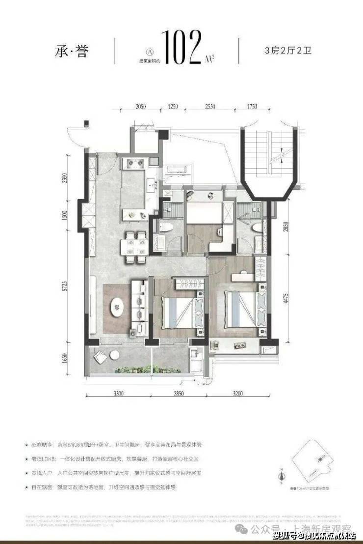 项目卖点:地处静安区核心地段,交通便利,配套成熟,户型经过精心打磨,空间布局合理,且采用全明设计,得房率高,装修标准高,配备中央空调、地暖、新风系统等。