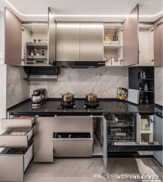 建发海宸打造了超容量橱柜,以更丰富的立体收纳空间,让空间化繁为简、化整为零,配齐吊柜拉篮、双侧台面调料柜、餐具与厨具收纳等,确保做菜时随手能拿到想要的调料,真正做到藏纳有道,拿放有序。