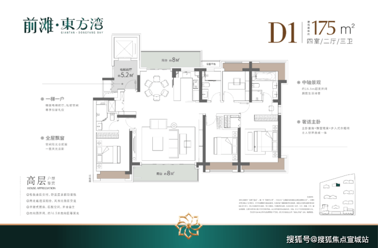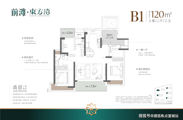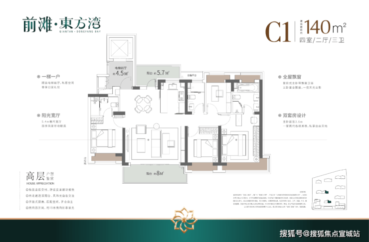 户型建筑层高3.1-3.15米,无连廊,双阳台配置。其中建面约103平户型2梯2户,其余一梯一户。