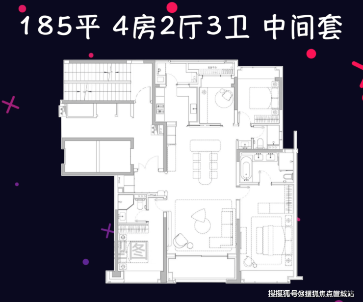中间套185平4房3卫,总价2188—2804万,采用四叶草布局,空间没有太多过道浪费,两个南向套房设计也比较实用。