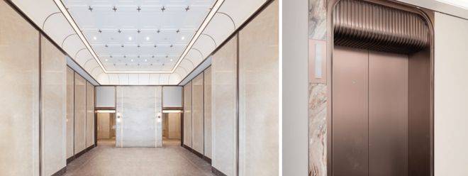 全干挂石材立面:外立面采用巴西都伯斯金麻、宏宇金麻全干挂石材,搭配铝板线条,现代简约风格,历久弥新,兼具质感与颜值。