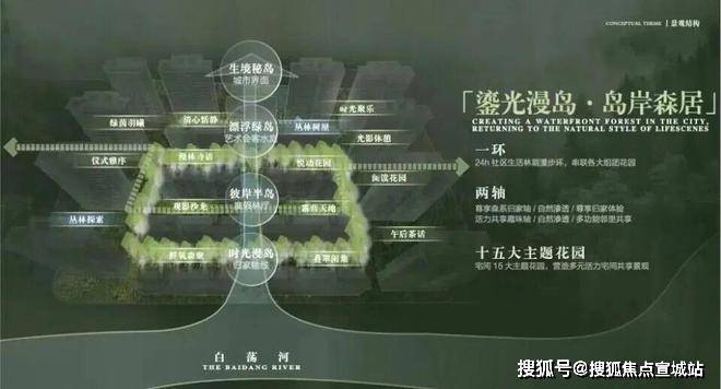 “山水聚场”理念,规划 “一环两轴十五园”景观布局,将水岸、岛屿、森林、花园、树屋作为园林节点,形成“行在景中、坐在岛中、游在林中、意在境中”的美学表达,营造出沉浸式山水活力场域。