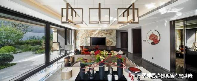 售楼处电话:400/8862/334【热线】地下空间,以古时的「雅集」为灵感,打造了一个氛围柔和舒适的休闲娱乐空间,挑空的设计,让空间显得大气非凡,顶面延续了之前紫禁明月中的方格金箔顶,墙面的大块水墨玉石,宛若矗立山林间。