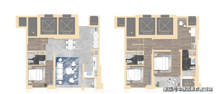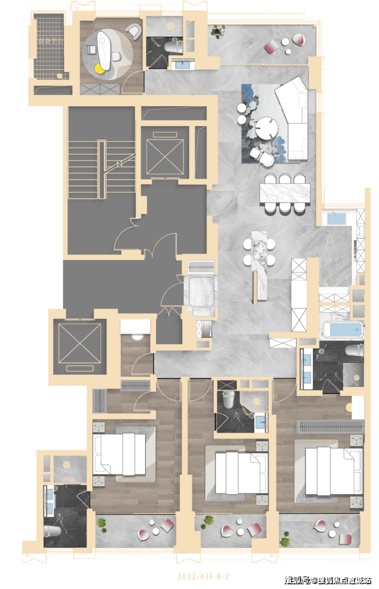 尤其主卧星级套房,配置独立衣帽间、书房,奢华主卫四分离,双台盆+淋浴区+大浴缸+智能马桶,私密性&奢适度无敌;