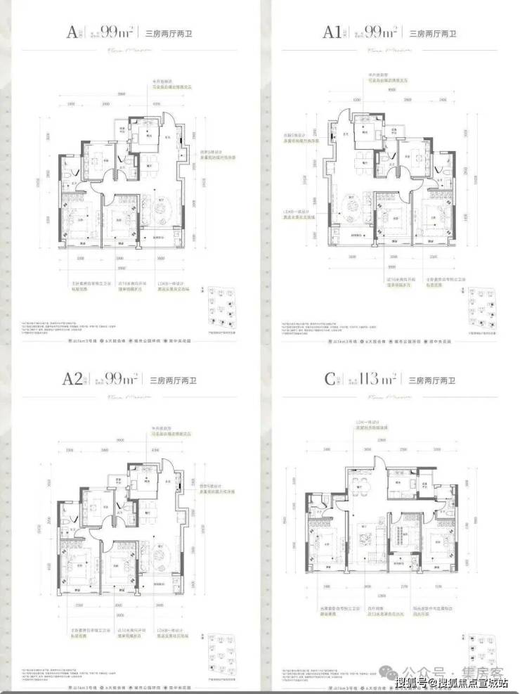 户型设计:建面约99㎡的三房两卫户型,动静分区,采用三开间朝南设计。建面约113㎡的三房两厅两卫户型,四开间朝南,拥有封闭式阳台,南向采光充足,使得整体空间更加宽敞明亮。