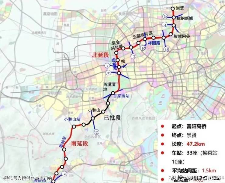 杭州地铁14号线分为南北两段,北段从崇贤开始,途经运河新城、西溪湿地。南段从小和山开始,一直到富阳西站,全程60多公里,沿途与地铁2、3、5、10、19号线均可换乘。