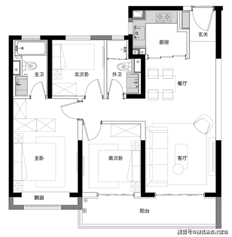 111㎡三房:明厨明卫,主卧朝南45